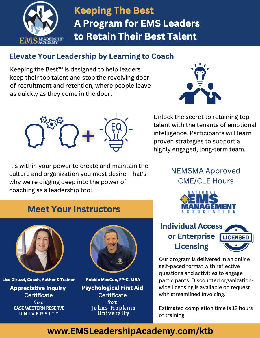 Keeping the Best™ was designed for EMS Leaders struggling to keep their top talent and stop the revolving door of recruitment and retention, where people leave as quickly as they come in the door.